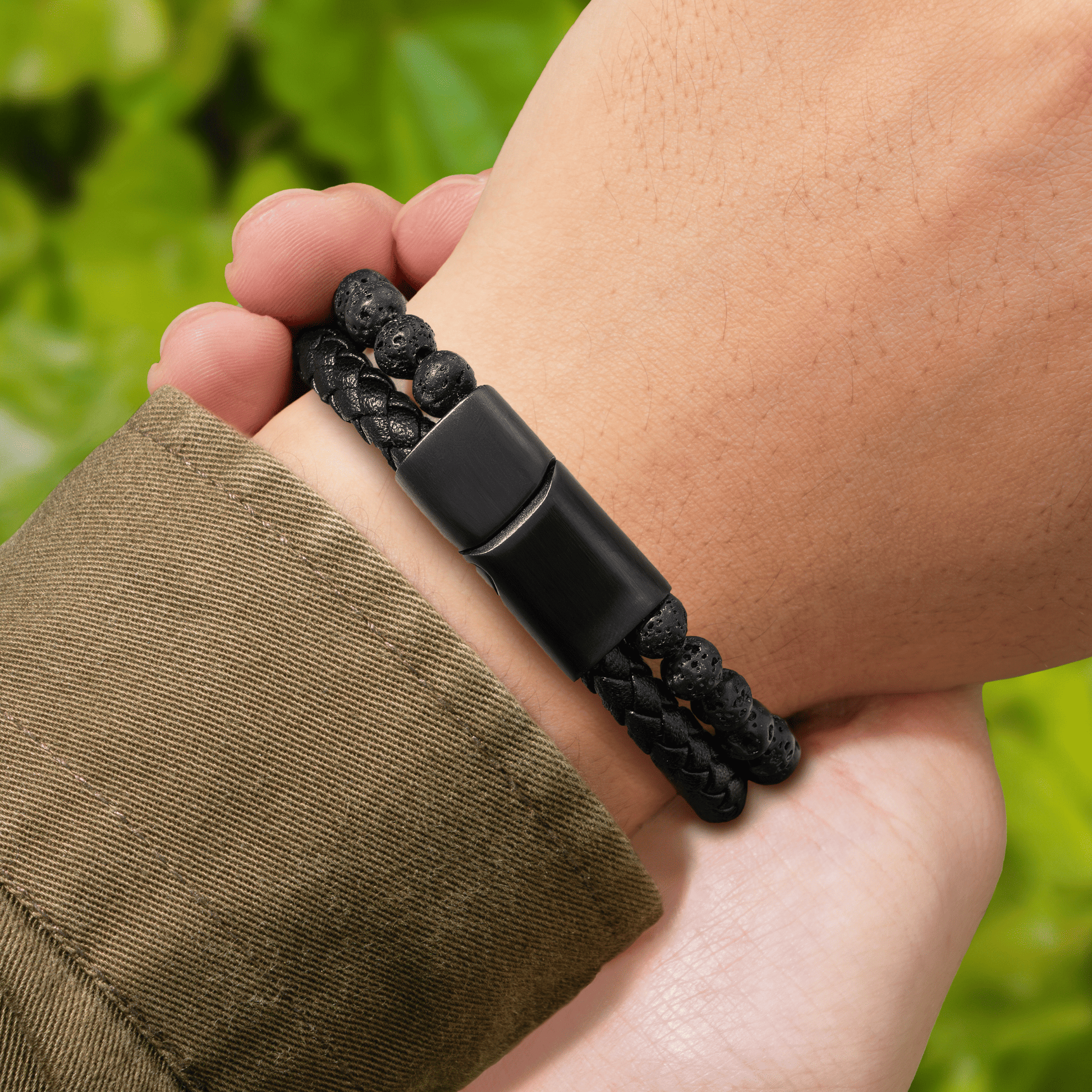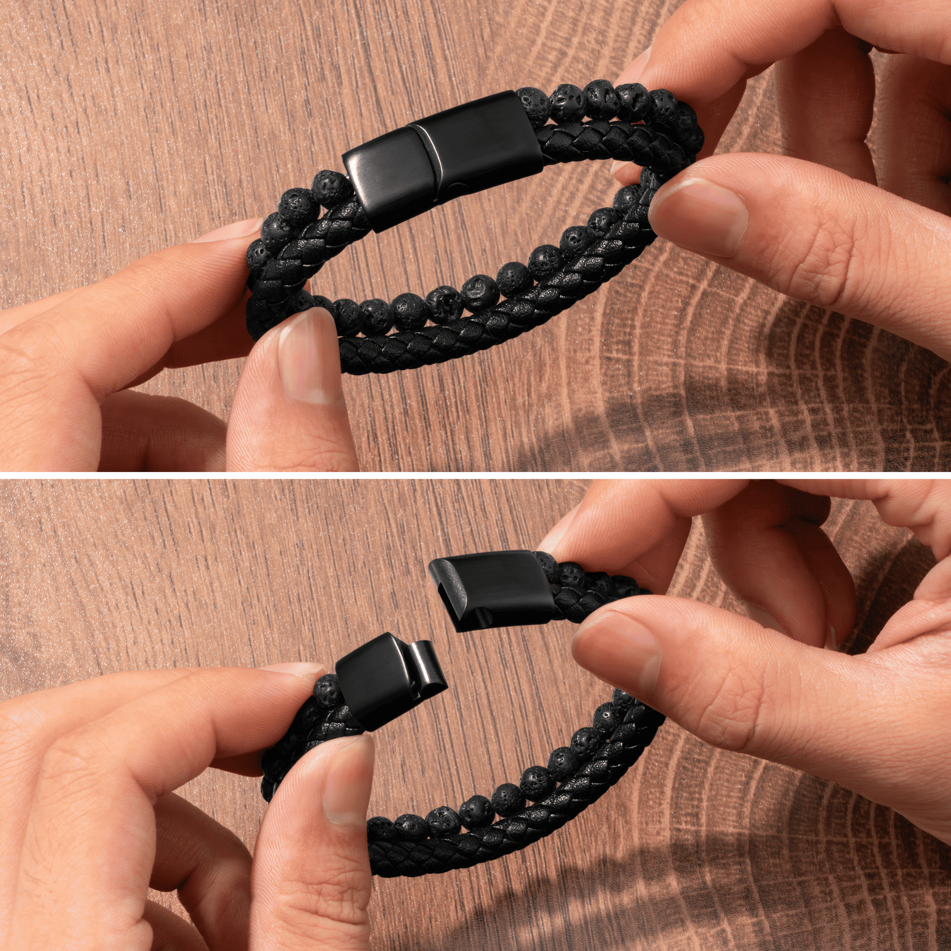 While metal pieces may sometimes show signs of wear over time, this bracelet is thoughtfully crafted with Volcanic Rock Stone, Weaving Leather, and a Magnetic Buckle — materials chosen for their lasting strength and resilience. The stones are naturally resistant to moisture and fading, while the high-quality leather and coated magnetic clasp help preserve their original look. With simple, occasional care, the bracelet maintains its refined appearance without losing its charm.