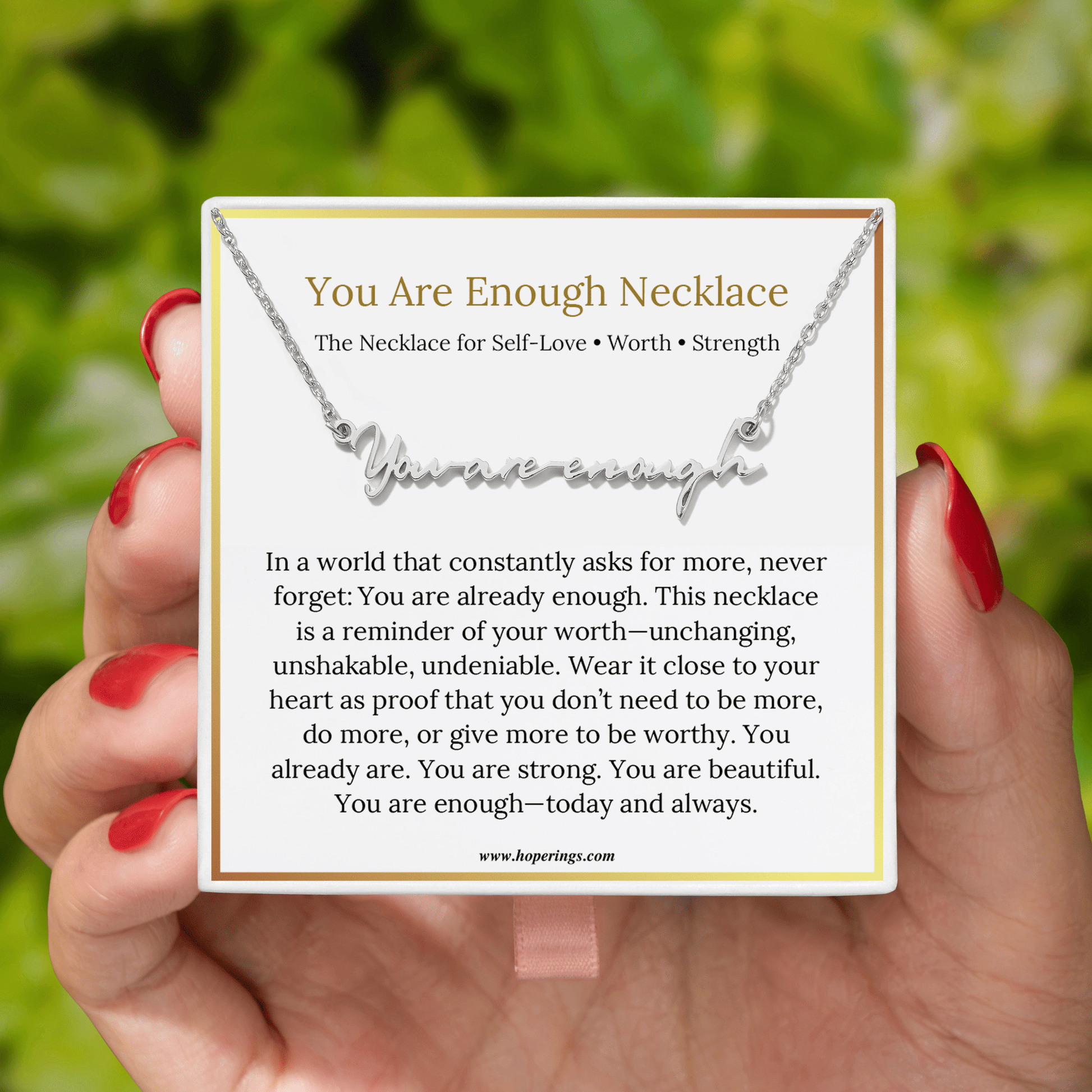“Got this as a gift and cried when I saw what was inside. I have no complaints it is gorgeous. I wear this necklace knowing that I am enough to get through whatever life throws at me.“