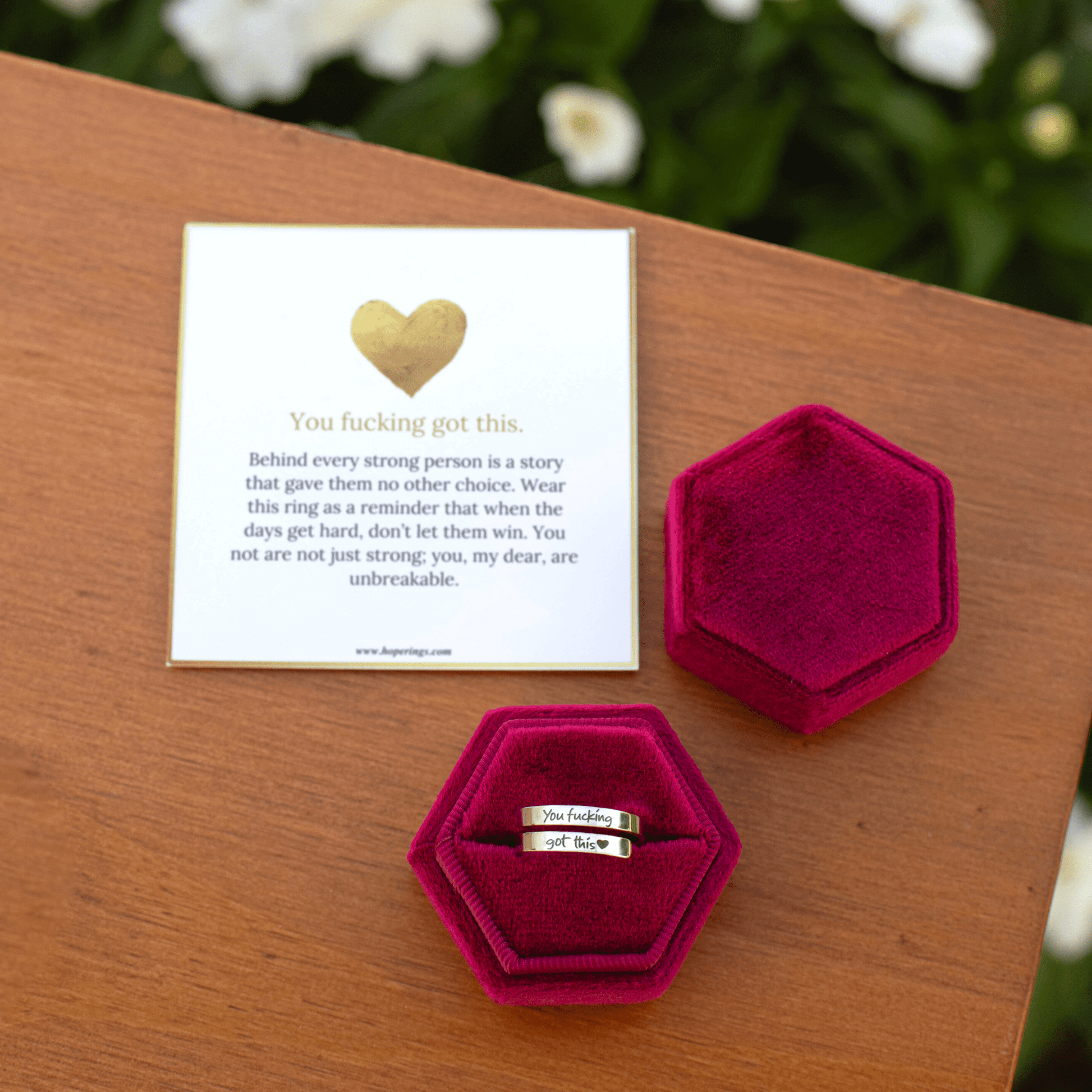 “Love this ring. I look at it numerous times a day to remind myself to breathe because I fucking got this !!! I love that it's durable and doesn't turn my finger green 🙃“